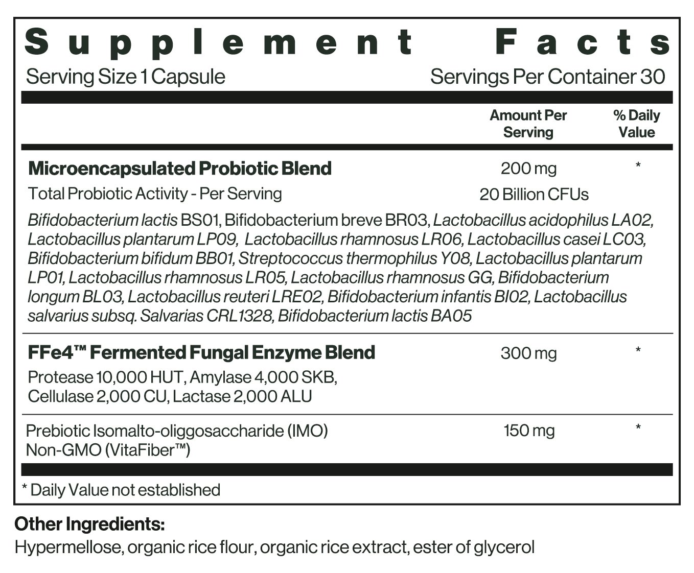 * Probiotics: 20 billion CFUs across 16 different strains for microbiome diversity, protected with microencapsulation technology to support survival. We list the alphanumeric designation of each strain directly on the label (ie. Lactobacillus acidophilus LA02) so that you know exactly you’re taking and can locate available scientific publications on the strains we've chosen.